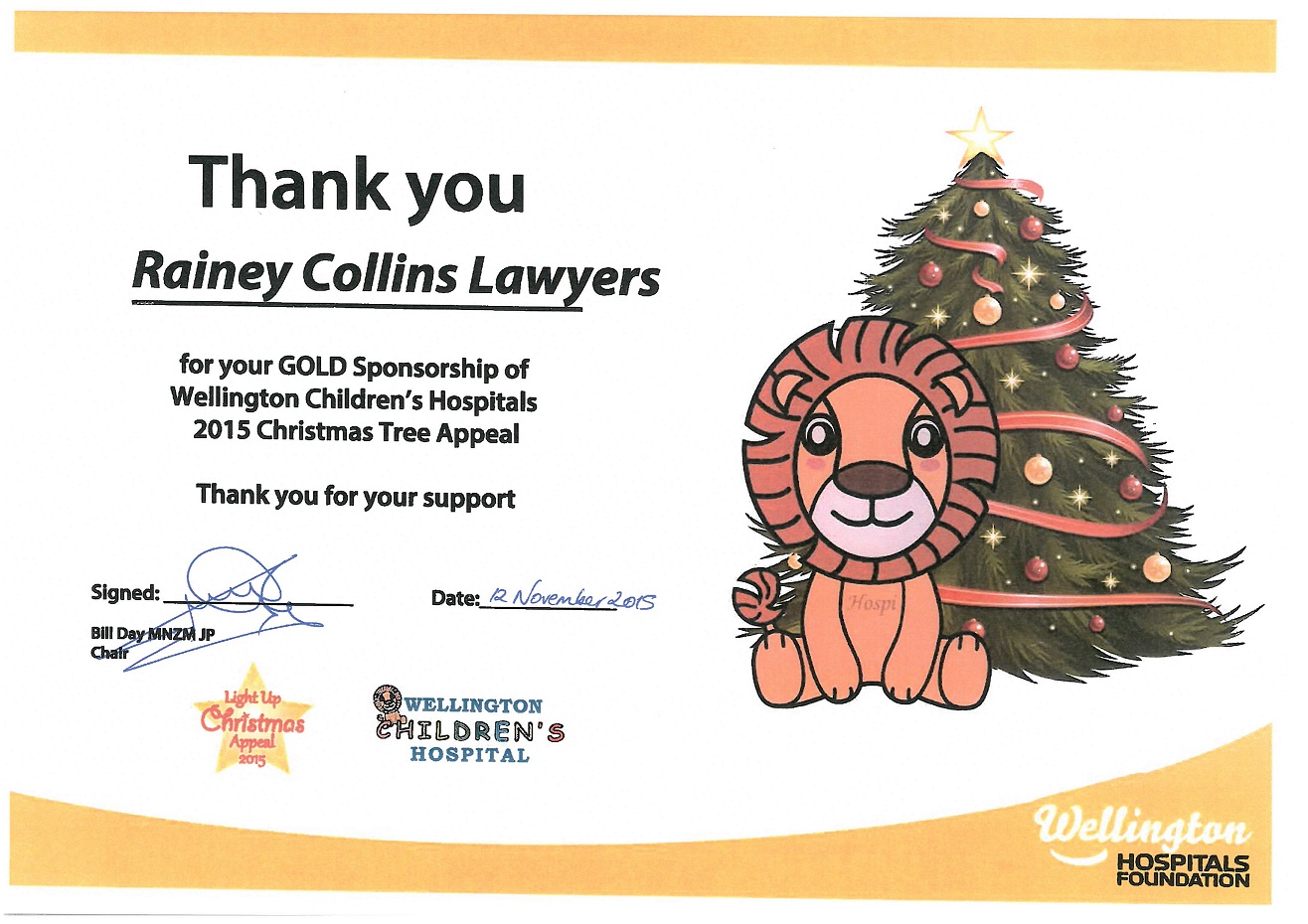 Rainey Collins is pleased to support Wellington Hospitals Foundation "Light Up Christmas" campaign for sick children at Wellington Children's Hospital.